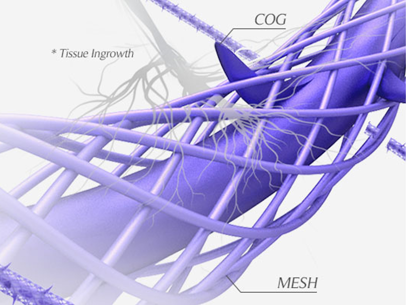 また、メッシュ内に入り込んだ周辺組織が自己組織に置き変わるため、糸が吸収され溶けた後でも形が残り、効果の持続期間が長くなる特徴があります。(約2年の効果持続が期待できます)