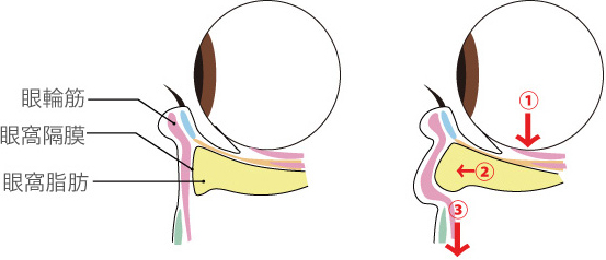 目の周りの筋肉(眼輪筋)が弱くなり、顔の内側にある脂肪が前に飛び出した状態。これが「目の下のたるみ」の正体です。