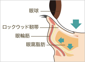 目の周りには骨がなく、骨の代わりに“眼窩脂肪”が眼球を支えています。そしてその“眼窩脂肪”は、表情筋の一つである“眼輪筋”と“眼窩隔膜”によって支えられています。