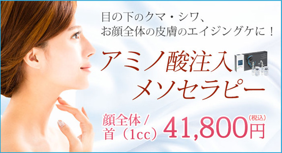 当院では、アミノ酸注入メソセラピー治療をおすすめしています。 アミノ酸注入メソセラピーは、イタリア生まれの「SUNEKOS (スネコス)」という注入剤を使用したシワ治療です。(従来のボリュームを出すヒアルロン酸とは異なる、非架橋ヒアルロン酸と6種のアミノ酸を組み合わせた安全性の高い製剤です。) 従来のヒアルロン酸では治療が困難だった部位にも施術が可能で、注射することでコラーゲンとエラスチンの合成を促進し、お肌を若返らせる作用があります。 目の下のクマやシワ、口元のシワ、ボツリヌストキシン注射では改善が期待できない小ジワ、たるみ毛穴やちりめんジワにも高い効果を発揮します。その他にも、お客様のシワの状態に合わせた治療を各種ご用意しています。 ぜひ一度当院へご相談ください。