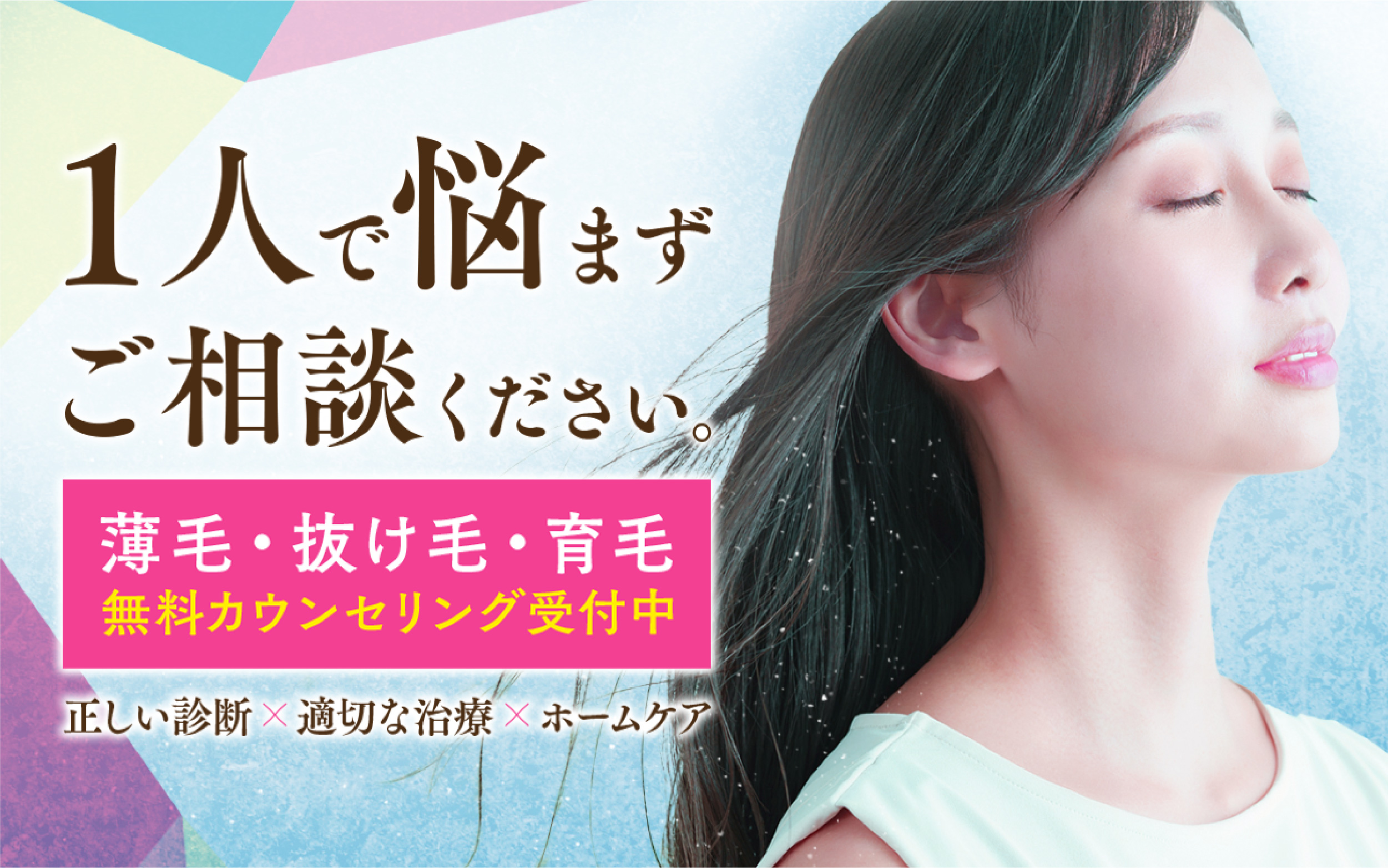 女性の薄毛は女性ホルモンのバランスと密接な関係にあり、原因が男性の薄毛より複雑なため、原因を見極め、症状に合った治療を施すことが大切です。 自己判断、自己ケアによる薄毛の進行や悪化を防ぐためにも、医師の診察のもと医療機関での治療をおすすめします。 当院では女性の薄毛治療に高い効果を発揮するペプチドを用いた再生医療「ヘアフィラー」治療を行っております。 シンシアでは女性の薄毛治療に関するご相談も承っております。まずは無料カウンセリングにてご相談下さい。 薄毛に関するページはこちら。