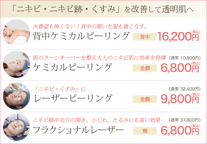 当院は、「背中ニキビ」にかぎらず、顔をはじめとしたあらゆる部位の「ニキビ治療」また「ニキビ跡治療」をご用意しています。