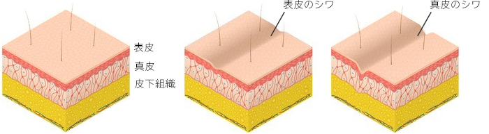 加齢による肌老化や紫外線ダメージによって、真皮にあるコラーゲンやエラスティンが衰え、肌の弾力が失われるとシワは真皮まで達し、大ジワができます。
