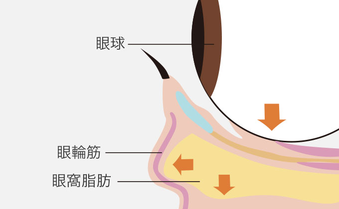 目の下のくまは眼球の周りにある眼窩脂肪がせり出してくることで起こります。 もともと目の周りには骨がなく、骨の代わりに眼窩脂肪が眼球を支えています。そして眼窩脂肪自身も、表情筋の一つである眼輪筋と眼窩隔膜によって支えられています。