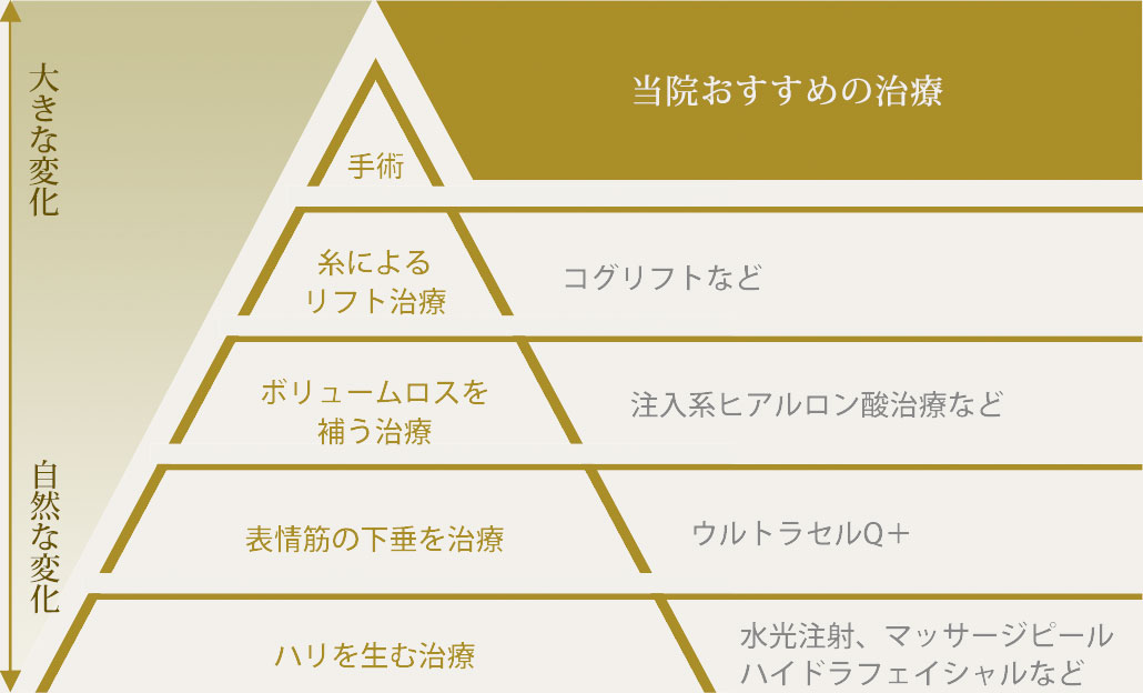 30代の早い段階でこのような対策を意識的に行うことで、将来のたるみの進行を緩やかにすることは可能です。求める効果と段階を追った「たるみ治療」