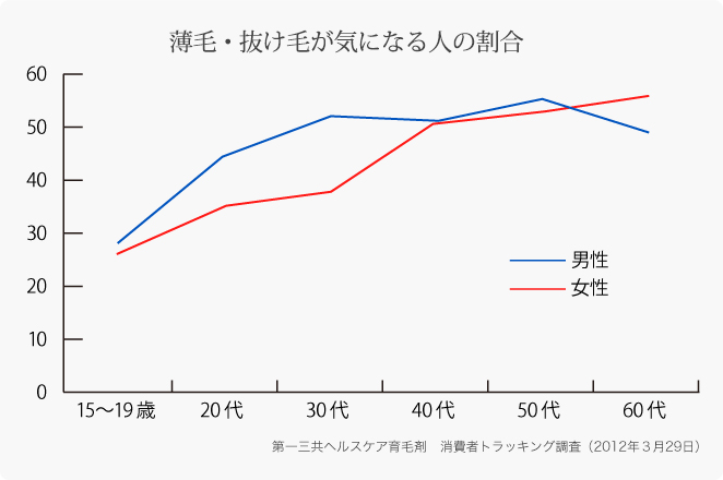 2012年に第一三共ヘルスケアが男女2万人に対して行った「薄毛・抜け毛」に関するインターネットでの調査によると、男女共に、加齢とともに薄毛、抜け毛が気になる人が増加していることがわかりました。
