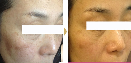 このお客様は、写真を見てわかるように、老人性色素斑と肝斑が混在して発生している状態でした。 行なった治療法は「レーザートーニング」と「シナール・トランサミンの内服」のコンビネーション治療です。   従来、レーザー治療は肝斑には禁忌とされていました。しかし、Qスイッチヤグレーザーを使用することによって、肝斑の原因であるメラニンのみを破壊し、メラノサイトへの刺激を最小限に抑える治療が可能となりました。   レーザートーニングを12回、シナールとトランサミンの服用を5ヶ月続けた結果、かなり症状は改善され、ご本人にも満足いただけました。   外側からのアプローチと、内側からのアプローチのコンビネーション治療が結果を出した症例です。