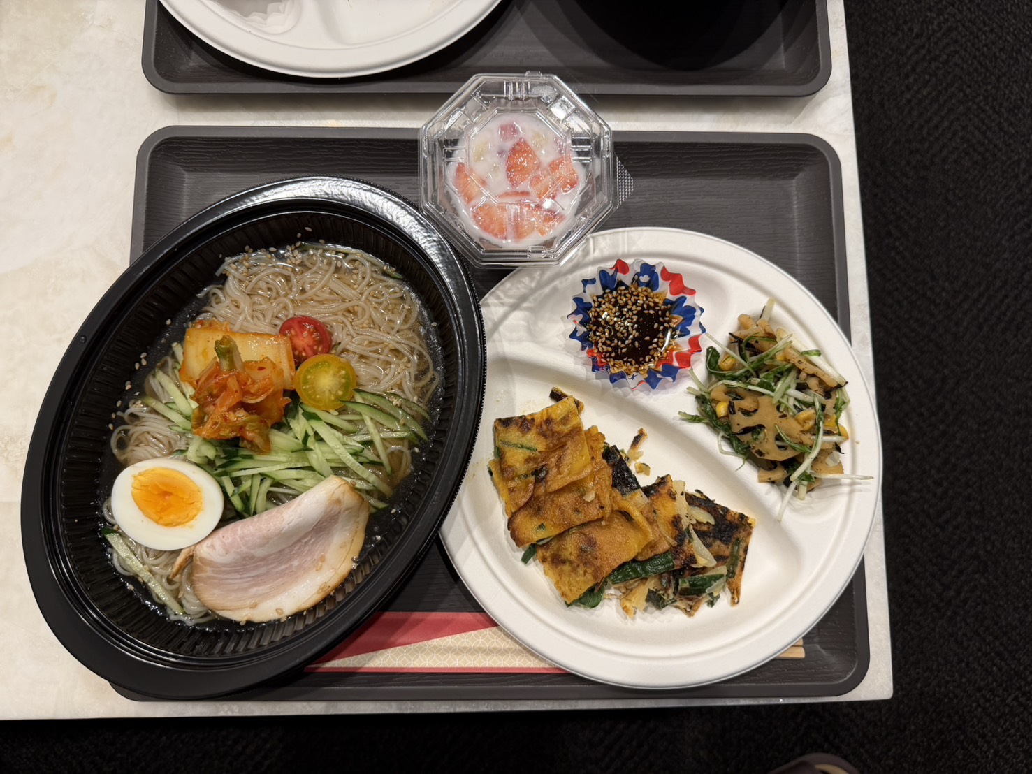 合わせるスープは、盛岡冷麺が牛コツや牛すね肉のスープであるのに対し、韓国冷麺は水キムチのつけ汁+肉の出し汁が主流です。