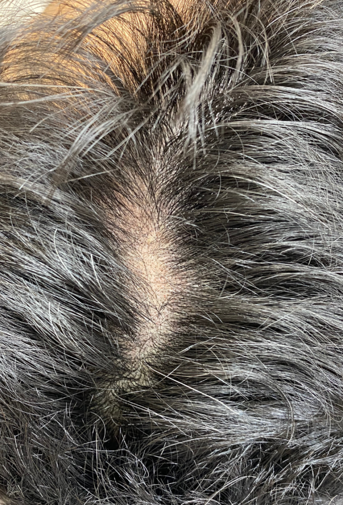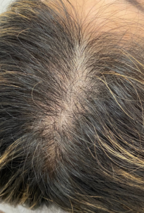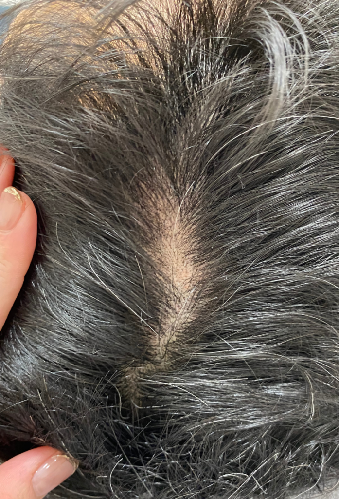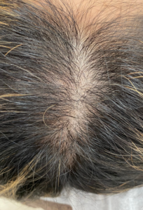 アートメイクとは皮膚の薄い層に医療用ニードルと色素を用い、回数を分けて皮膚の浅い層に染色していく施術です。症例は生え際~頭頂部3回直後の様子です