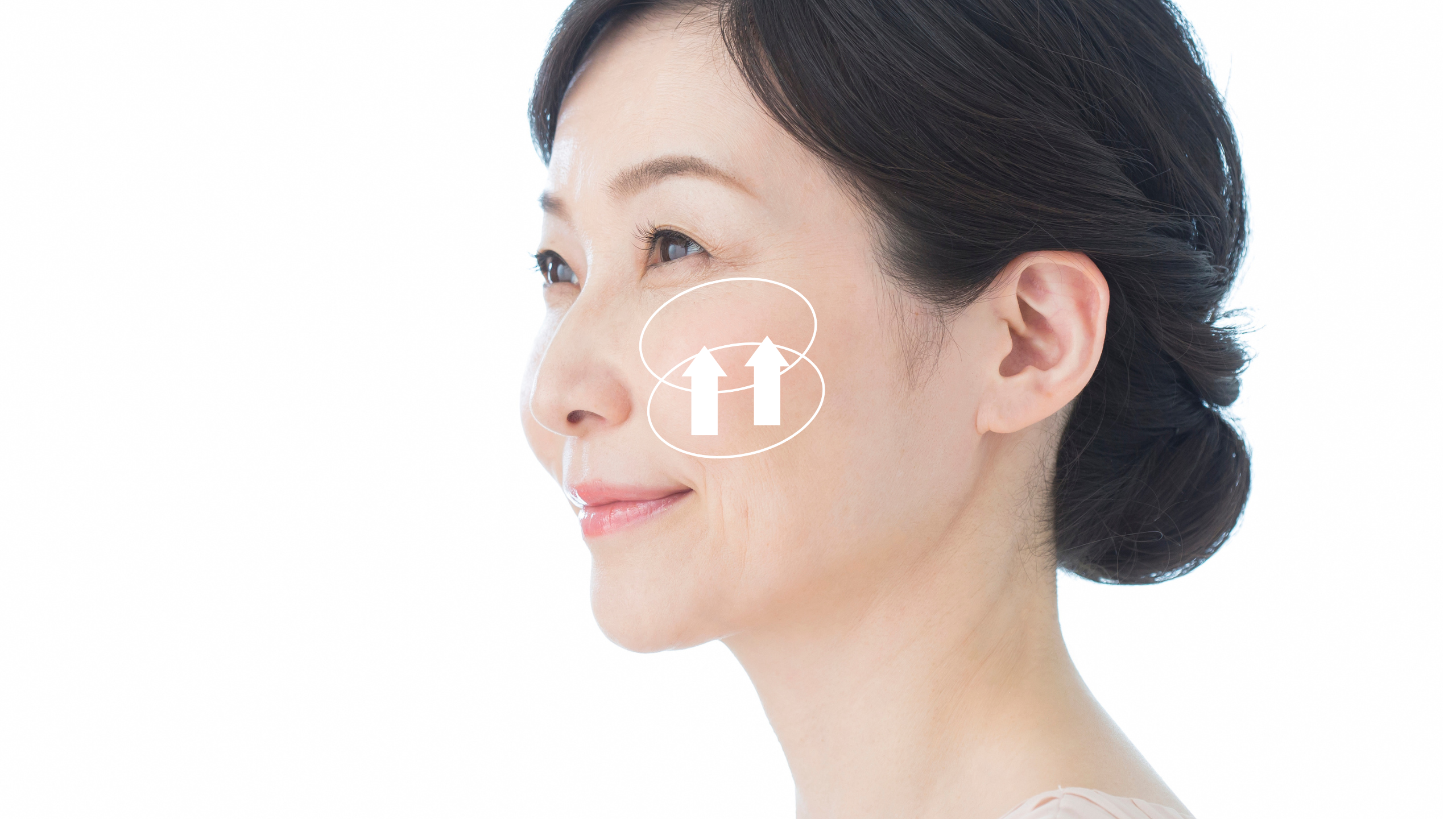 ヒアルロン酸注入により、下がった頬の位置を引き上げ、高さを出すと、若々しい印象になります。