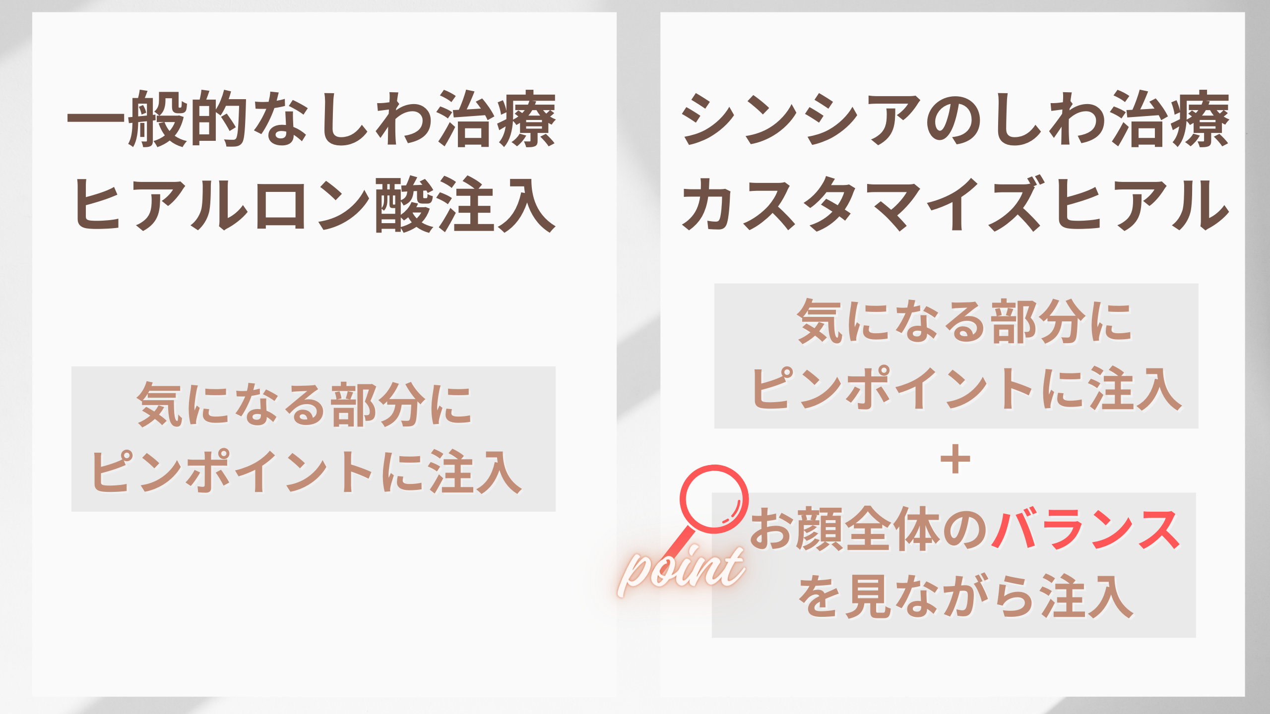 一般的にはヒアルロン酸を「法令線などピンポイントに注入」し、しわを改善しますが、シンシアのカスタマイズヒアルロン酸治療は、お顔全体のバランスを考えながら若々しい印象をつくる方法です。「お顔を総合的にデザイン」しているということが特徴的です。