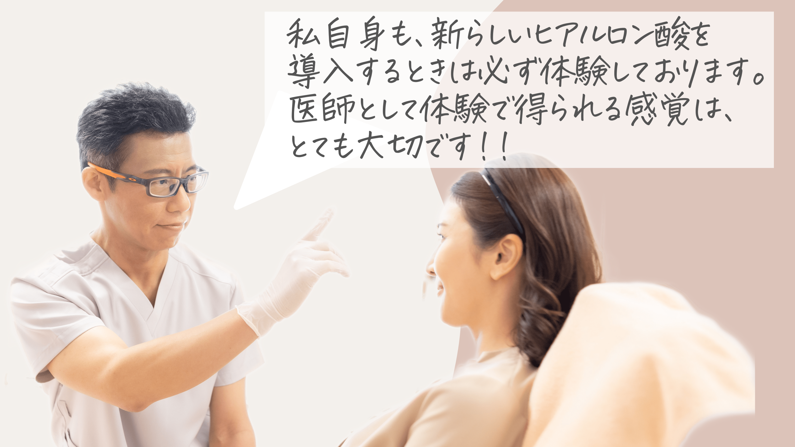 ヒアルロン酸注入で使用する製剤によって柔らかさ、効果の持続期間などが異なるため、当院では数種類のヒアルロン酸を用意しております。