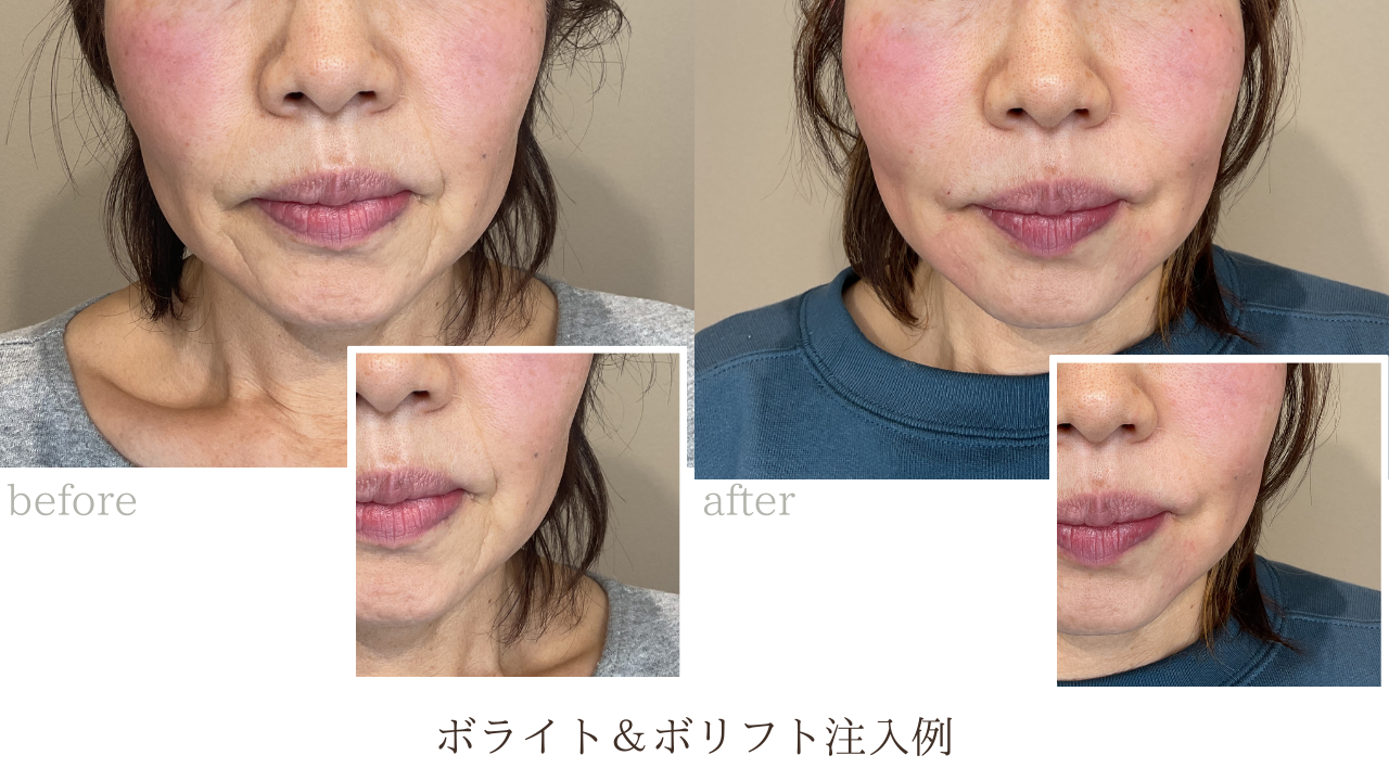 こちらの症例は圧倒的保水力を肌に直接注入するヒアルロン酸「ボライト」と、法令線等の深いしわに最適なヒアルロン酸「ボリフト」を組み合わせた治療例です。