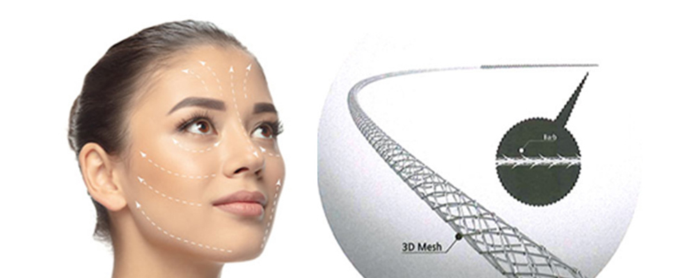 テスリフトは、とげのついた糸の周りに3Dメッシュが覆っている特徴的な形状の糸を皮下組織に入れてリフトアップを行います。とげが皮下組織をしっかり掴み、周辺組織が3Dメッシュ内に入り込むことでリフトアップした状態を長期間保つことができる、持続力にすぐれた施術です。