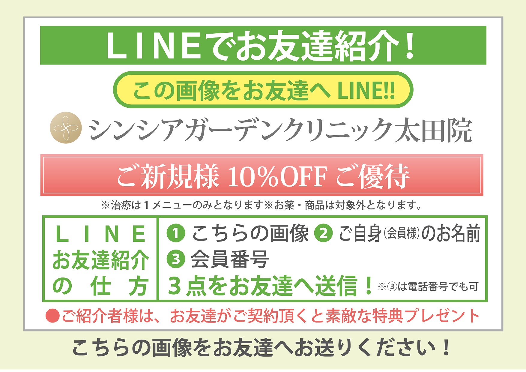 シンシアガーデンクリニック太田院では、当院で大切なお友達をご紹介して頂くと… ご新規の方へ10%OFFご優待をさせて頂いております。 ご紹介様にも素敵な特典をプレゼントさせて頂きます。 ご紹介方法は簡単! ①上記の画像 ②会員様のお名前 ③会員様の会員番号(お電話番号でも可) 上記3点... 【もっと読む】