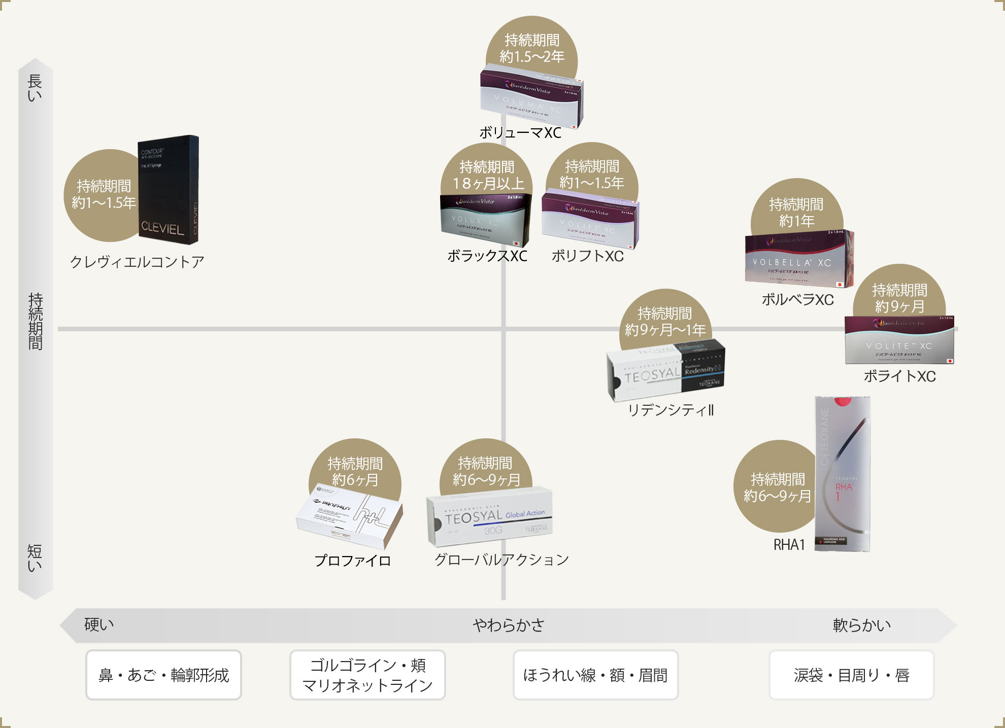 ヒアルロン酸注入で使用する製剤によって柔らかさ、効果の持続期間などが異なります。そのため、注入部位や状態に合わせて注入方法や製剤の種類を変える必要があります。
