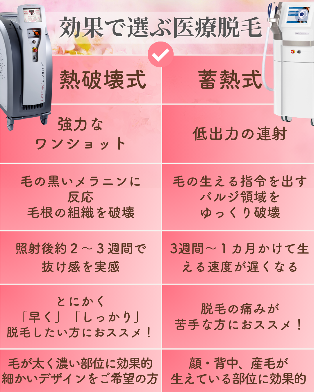 熱破壊式はメラニン色素のあるものに反応する脱毛法。   黒い毛根があると反応して熱を強く与え、毛を生やす組織を破壊して毛が抜ける状態にします。 高出力レーザーなので効果実感を早くしたい方へおススメです。   もちろん、熱破壊式と蓄熱式の脱毛はどちらも良い点がございますので、お客様のお肌状態により最適な脱毛器をお選びいただくことも可能です。