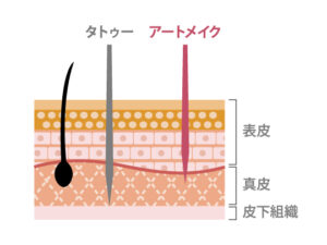 アートメイクとタトゥーの違いは、ニードルを入れる深さ、染料です。タトゥーは真皮まで針を入れるのに対し、アートメイクはターンオーバーで生まれ変わる表皮までにしか入れないので滲みにくく繊細な線を表現できます。また、痛みも少なく、タトゥーは永久的に残るのに対し、アートメイクは半年から1年で徐々に薄くなるのが特徴です。
