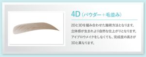 施術内容: アートメイクとは皮膚の薄い層に医療用ニードルと色素を用い、回数を分けて皮膚の浅い層に染色していく施術です。