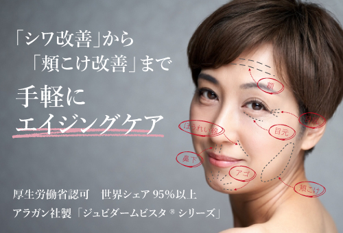 施術の説明:スネコスはヒアルロン酸と6種のアミノ酸を真皮層へ注入し、コラーゲンやエラスチンを増加させお肌のハリや弾力を改善していく施術です。ヒアルロン酸やボトックスの施術では難しかった箇所にも注入でき、幅広い範囲の治療に向いています。