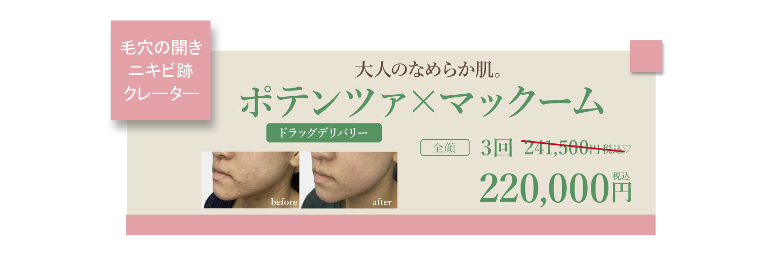 そしてマックームとは、ニキビ跡のクレーターや毛穴を改善に導く、ポテンツァ専用に開発されたPLLA製剤で、アレルギーリスクが少なく安全性の高い成分です。