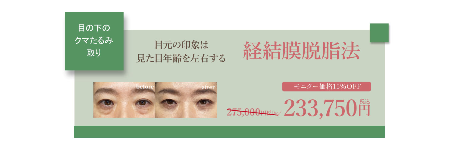術後のダウンタイムも少なく、皮膚表面に傷跡が残らずに、目の下のたるみやクマが改善できる人気の治療です。