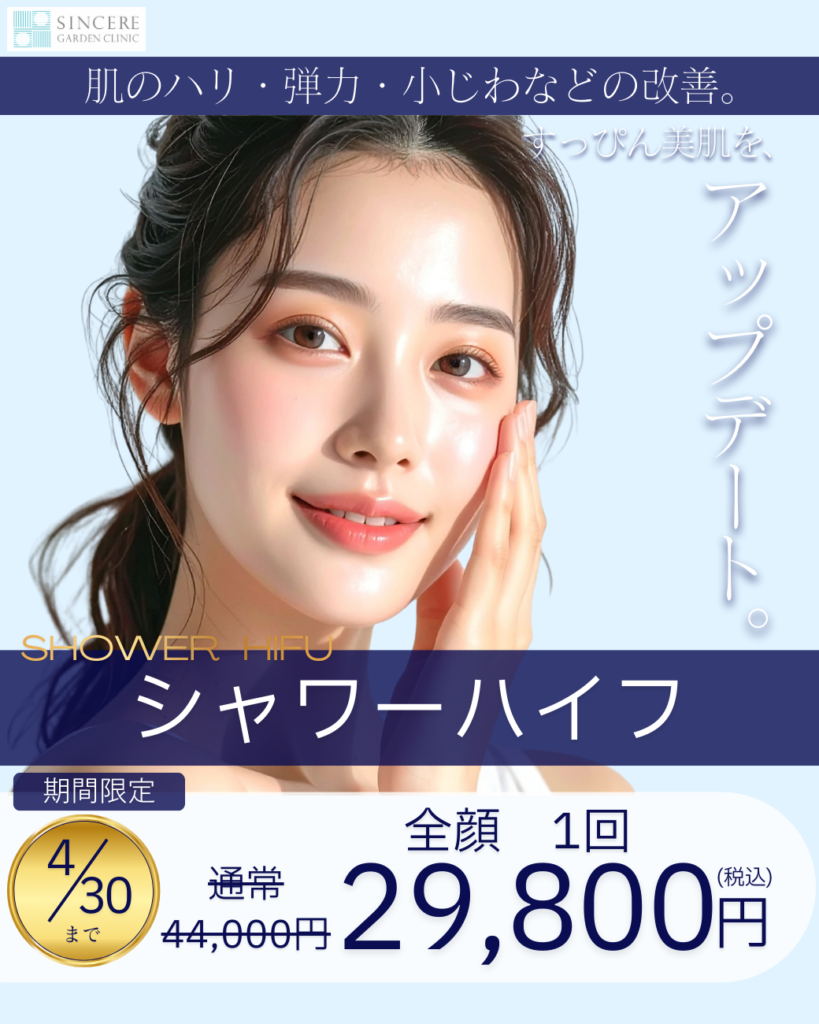 真皮層に熱を届けるシャワーハイフは、肌表面の引き締めと肌質の整えを同時に行います。ハリ感のある若々しい印象をかなえたい方におすすめです!ダウンタイムがほとんどないため、大切な写真撮影や集まりの数日前でも受けていただける、春の人気メニューです。