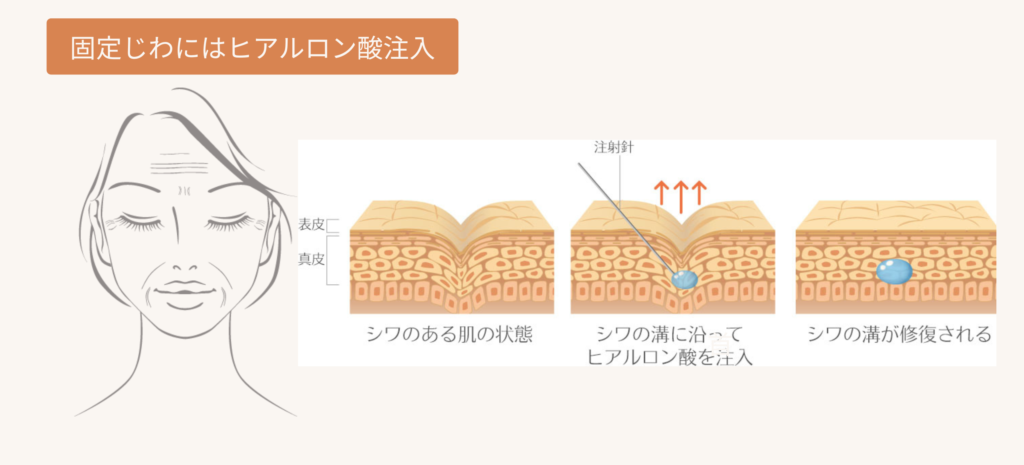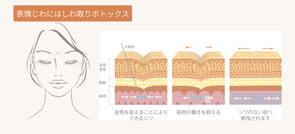 しわ取りボトックスは一時的に筋肉の過剰な動きを抑えることで、しわを出にくくする効果があります。 筋肉に送られる神経伝達を少し抑えるだけなので、筋肉そのものに直接ダメージはありません。 目尻、眉間、おでこ、あごに出る梅干しじわ、唇の上に出る縦じわ、など表情筋に関わる部位のしわに有効です。
