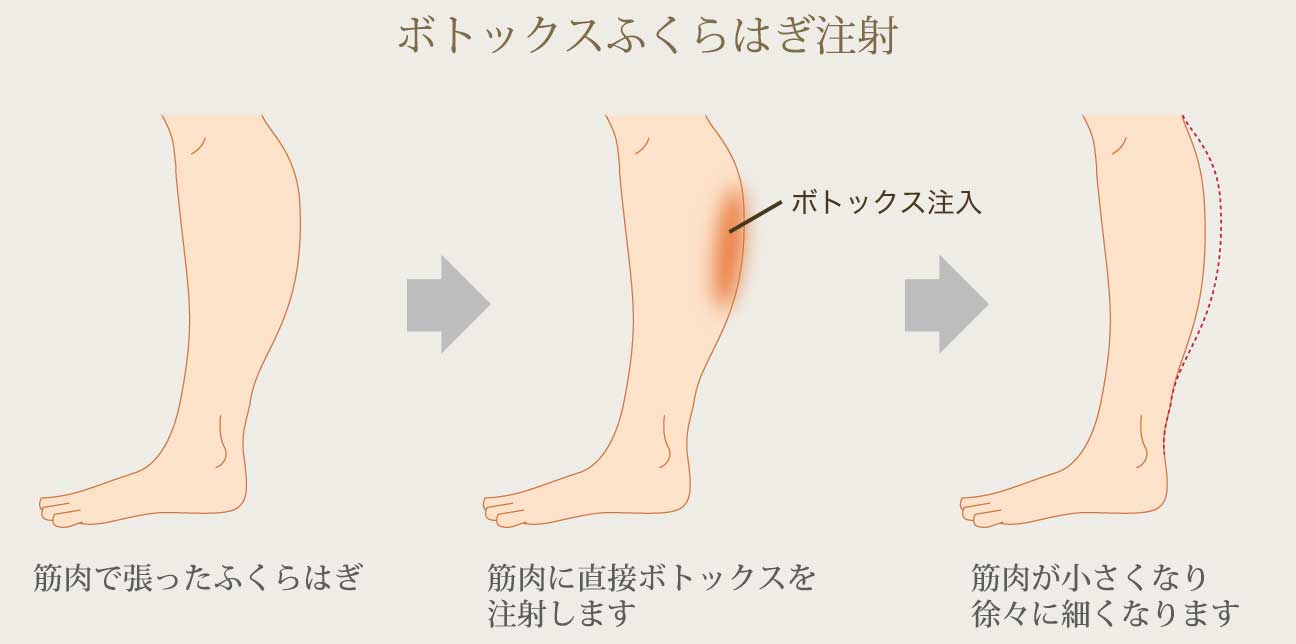 脂肪太りではなく、筋肉が発達しているために太いふくらはぎは、ダイエットやエクササイズでは細くすることができません。筋肉で張ったふくらはぎへ直接ボツリヌストキシンを注射することで、徐々に筋肉が小さくなり、理想の脚のラインを手に入れることができます。持続期間は約6ヶ月ですので、定期的に施術を受けることで細いふくらはぎを維持することができます。