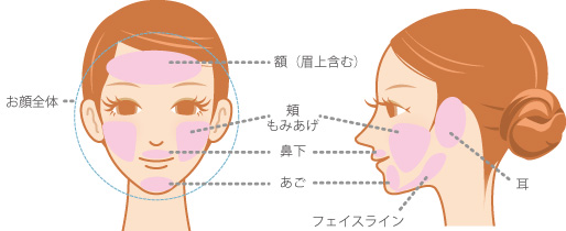 - お顔全体には5部位の他に鼻や眉間等すべての部位が含まれます。
