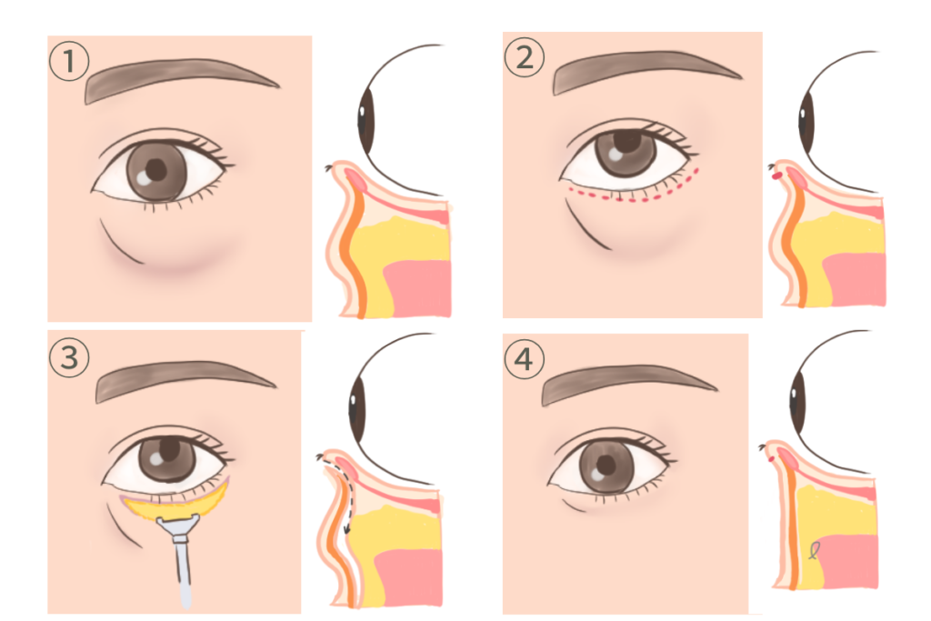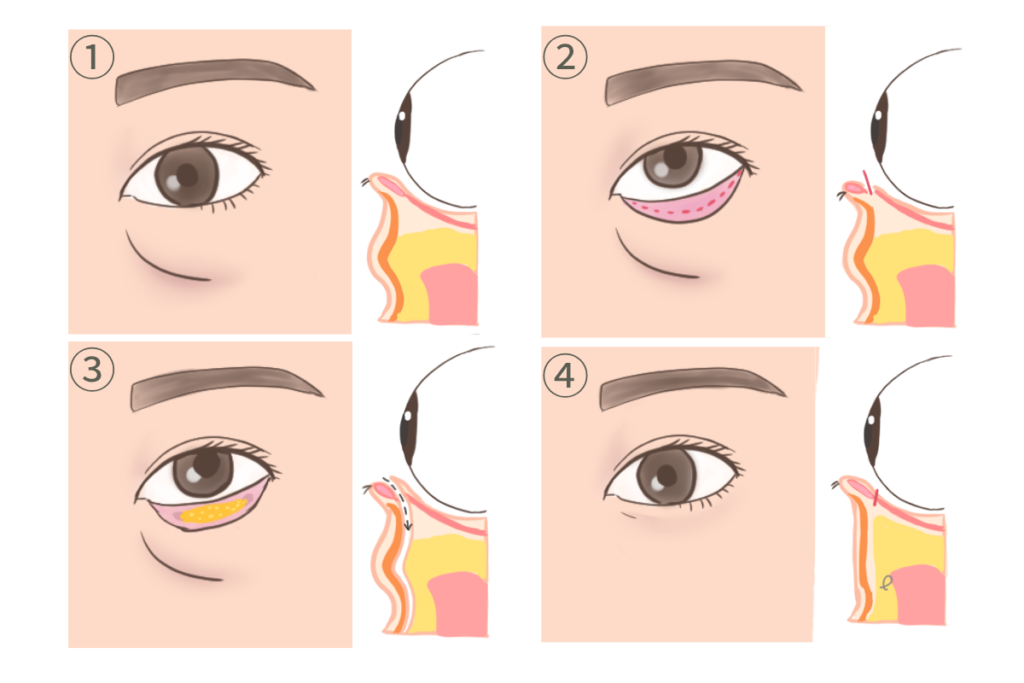 ④余分な脂肪を目の下の骨の凹みに移動させ、平らにならして固定します。たるんだ皮膚がある場合は切除して縫合します。