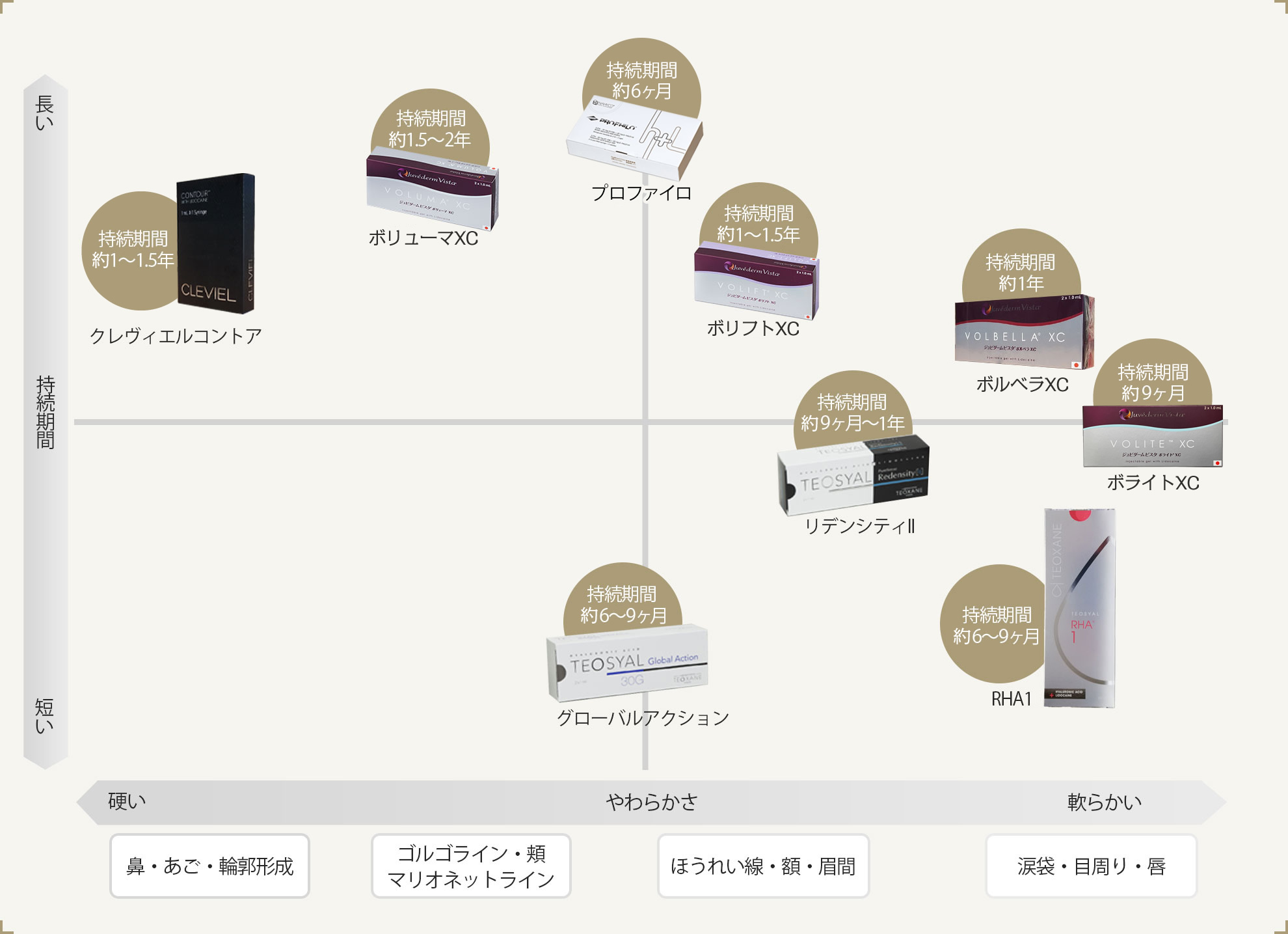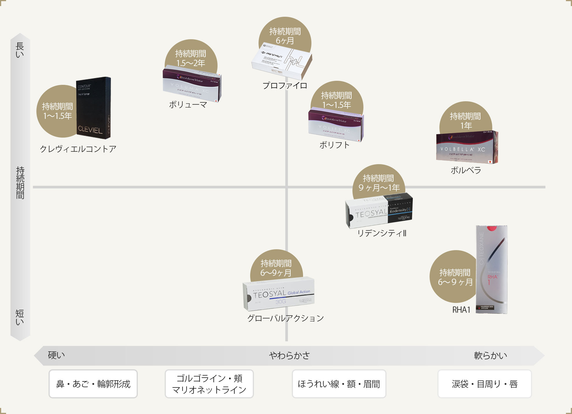 ヒアルロン酸注入で使用する製剤によって柔らかさ、効果の持続期間などが異なります。そのため、注入部位や状態に合わせて注入方法や製剤の種類を変える必要があります。