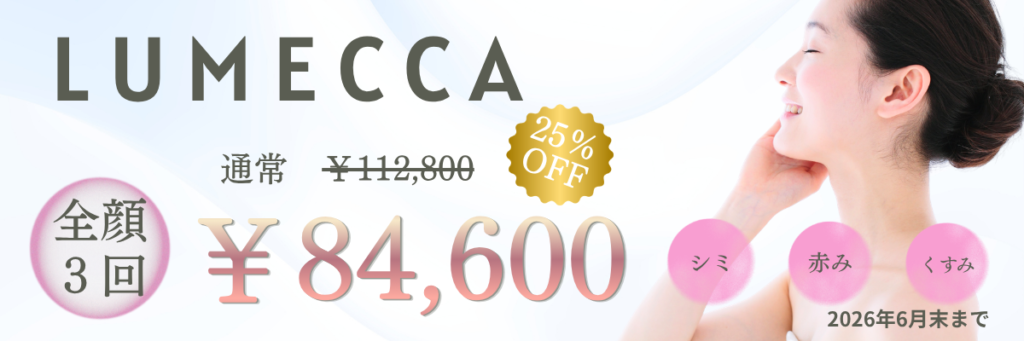ルメッカは、濃いシミ、薄いシミ、赤み、くすみを整え、肌を一段と明るくする治療です。