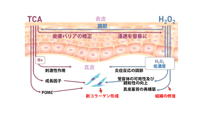 過酸化水素はTCAの働きにより素早く表層のバリアを通過し、真皮乳頭層に至り、TCAはゆっくりと浸透し、より深層まで到達し、