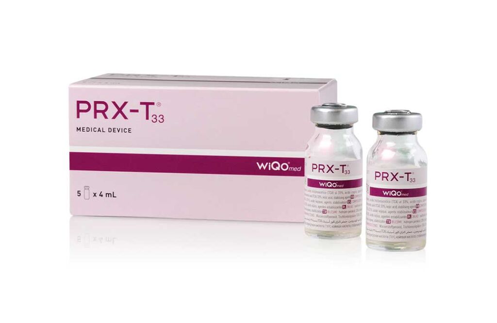PRX-T33を肌に塗布すると、TCAと過酸化水素(H₂O₂)は異なるスピードで皮膚のバリアを超えて、異なる深さまで到達します。