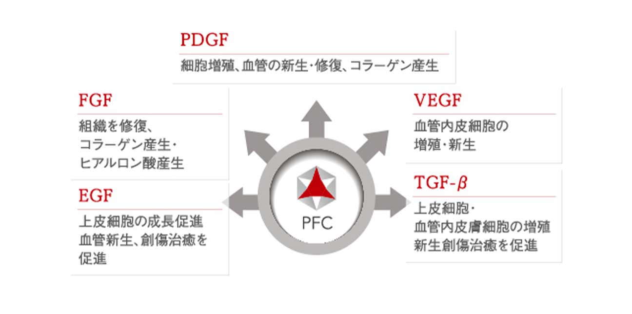 高濃度に濃縮し、活性化させた成長因子は、組織を修復する治癒作用と、美肌成分を生成する作用を併せ持っています。