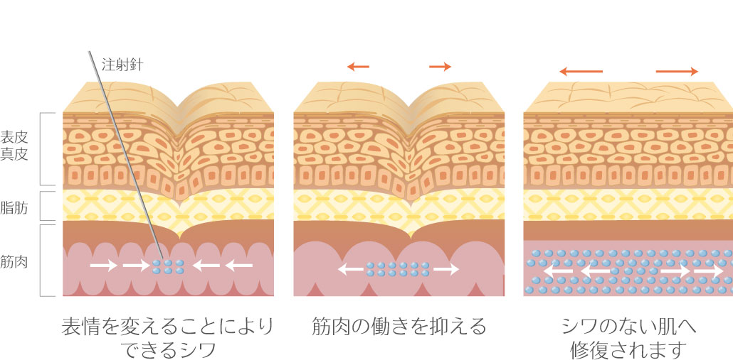 一時的に表情筋の収縮を弱めることで、シワをできにくくする治療。