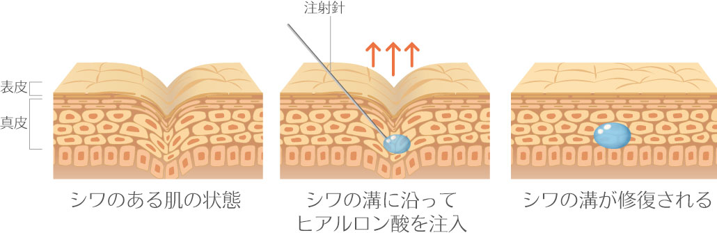 お肌の「しわ」、「たるみ」、「くぼみ」に直接ヒアルロン酸を注入し、溝・窪みを埋める治療。