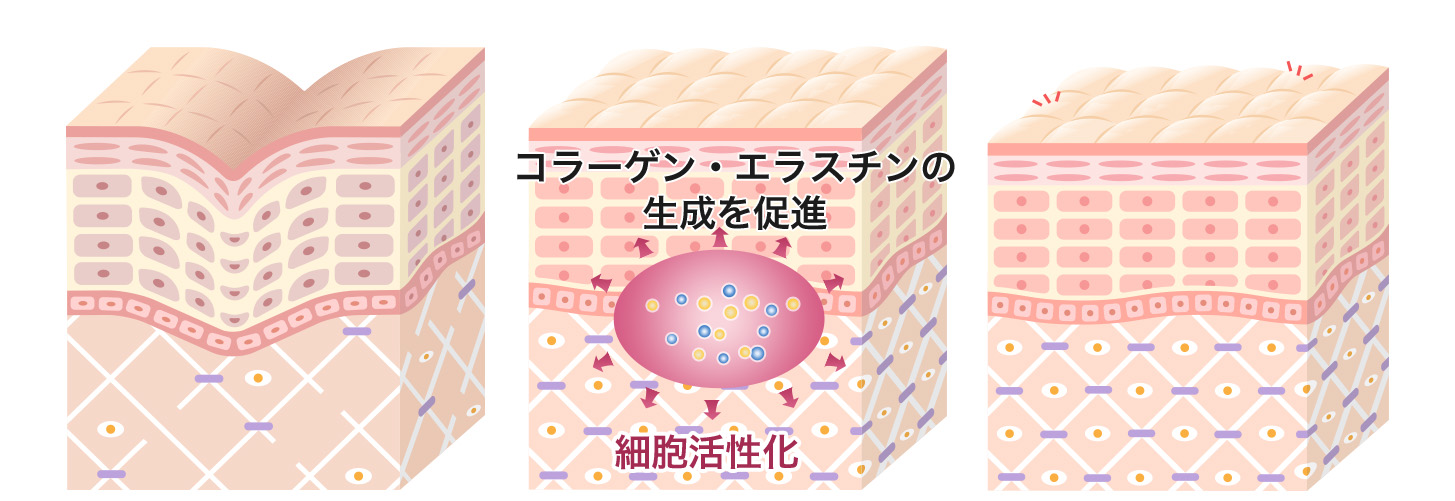 プロファイロは、肌の土台である真皮の肌細胞に働きかけて劣化した組織をリモデリングし、皮下組織を修復します。